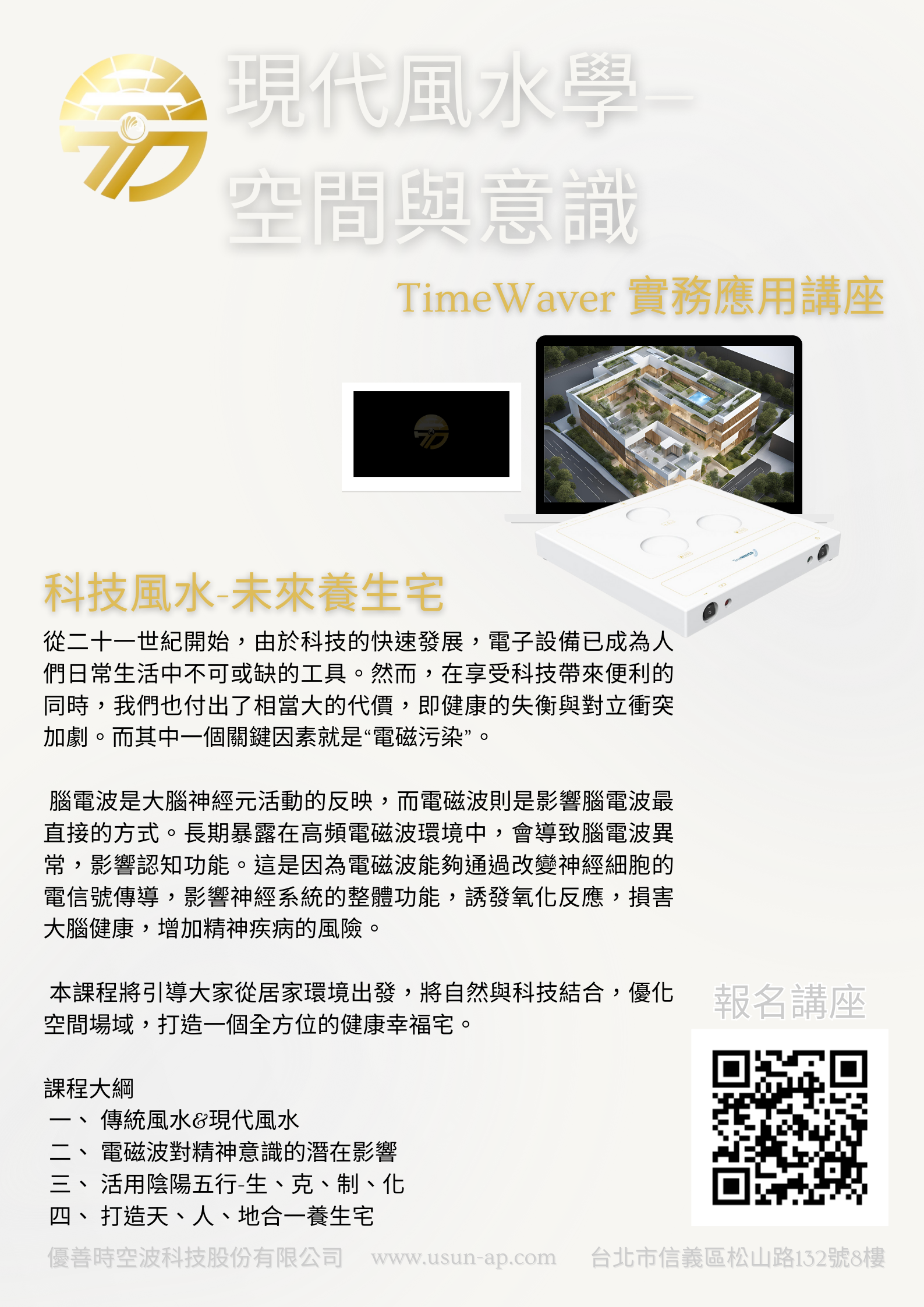 本課程將引導大家從居家環境出發,將自然與科技結合,優化空間場域,打造一個全方位的健康幸福宅。
