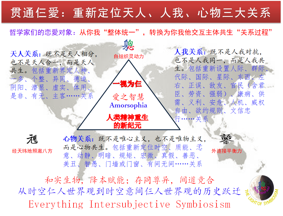 Intersubjective Symbiosism,可譯為“主體間性共生”或“互動主體共生”,是時空意間觀的生理、心理、倫理展開。個體之間、群體(共同體或共生體)之間,即人際、群際、國際之間,通過交流、理解和互動,建立一種互惠互利、共襄生活的關係。這種關係不僅涉及共享資訊和知識,還包括情感支援、資源共享和共襄決策。主體間性共生強調個體生命的“本自具足又非獨存”,所以,個體在社會中不是孤立的存在,而是通過你、我、他(她它祂)全人稱或全生態的互動和合作,通過“存同尊異,間道競合”的思維方式與價值取向,形成更複雜、更具效能與公義、更美好良善的社會結構、關係網路和生活方式。