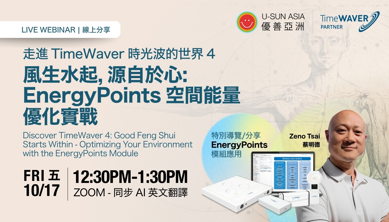 在TimeWaver系列的第三場線上分享會,Zeno Tsai老師將 帶領我們探索一個極其強大的工具:【EnergyPoints 模組】。這個模組能將東方的風水、場域概念,與西方的量子信息科技完美結合,讓我們有能力去分析、和諧化並顯化我們理想中的空間能量。