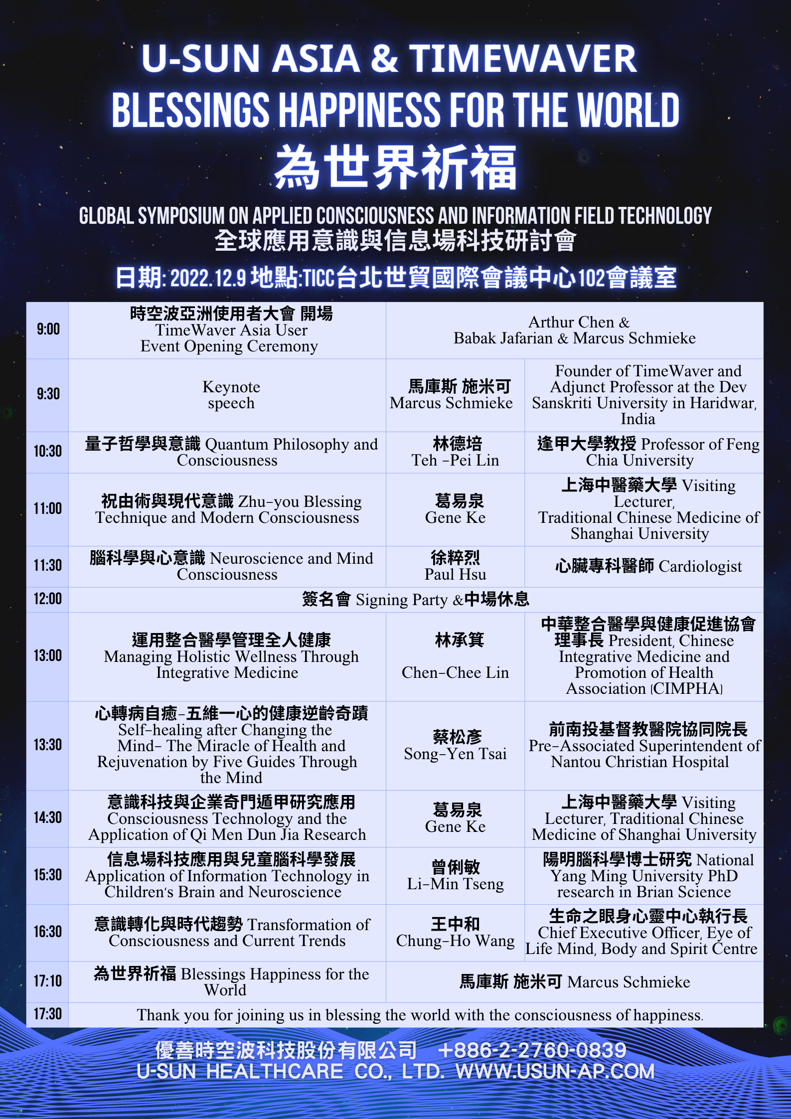 來自全球頂尖意識科學研究專家和 德國信息場技術發明人Marcus 與全方位的健康醫師,企業顧問講師,一同在台北舉辦時空波亞洲使用者大會及研討會活動, 歡迎您來預定自己的"時空波"座位, 用幸福的意識祝福世界!